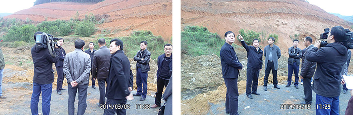 2014年3月5日下午,肇庆市副市长范汝雄、封开县县长黄学武一行带领有关部门领导来到封开县生活垃圾卫生填埋场建设工程施工现场视察工程情况。范汝雄副市长对施工现场进行了查看,做出了一系列工作指导;同时指出,在确保施工进度的情况下,要把质量安全放在首位;此刻正处雨季,一定要做好填埋场库区的防洪排水工作,防止库区边坡因雨水的冲刷而发生地质灾害。