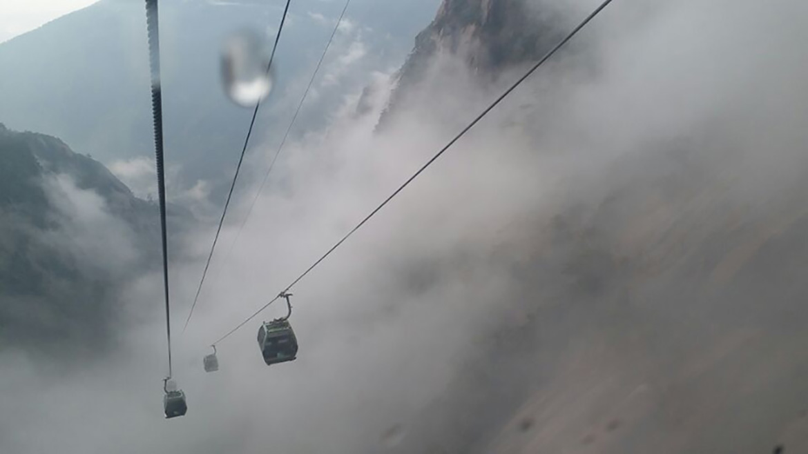 经过漫长的排队等候我们终于坐上了上山的缆车。随着缆车的慢慢高升,缆车外雾气越来越深,穿过云层后看到黄山的真面目,黄山上特有的松树正向我们伸出手来欢迎我们呢! 真是好美啊!
