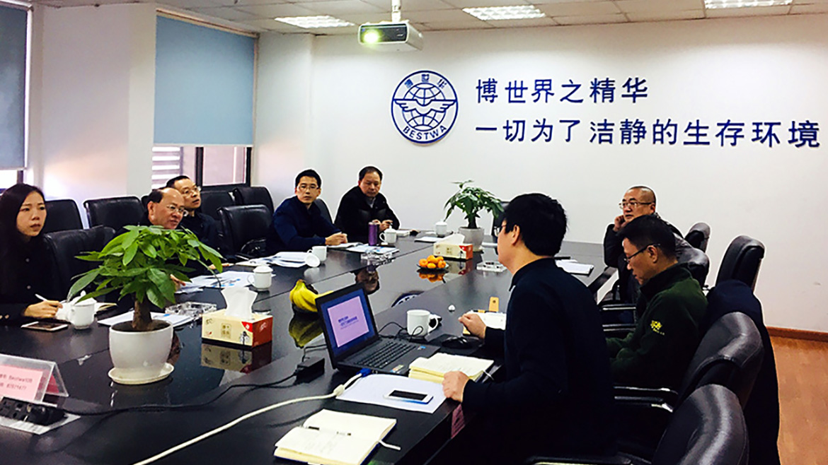 博世华环保负责人向经信委调研工作组介绍了博世华总部以及承担环保装备生产的贝格勒全资子公司的生产经营情况,并与调研工作组就新形势下环保设备生产的转型升级及工程管理向工程服务的延伸,做了深入探讨。