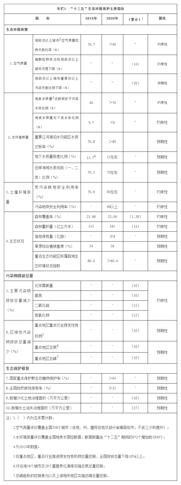 生态环境质量有所改善。2015年,全国338个地级及以上城市细颗粒物(PM2.5)年均浓度为50微克/立方米,首批开展监测的74个城市细颗粒物年均浓度比2013年下降23.6%,京津冀、长三角、珠三角分别下降27.4%、20.9%、27.7%,酸雨区占国土面积比例由历史高峰值的30%左右降至7.6%,大气污染防治初见成效。全国1940个地表水国控断面Ⅰ—Ⅲ类比例提高至66%,劣Ⅴ类比例下降至9.7%,大江大河干流水质明显改善。全国森林覆盖率提高至21.66%,森林蓄积量达到151.4亿立方米,草原综合植被盖度54%。建成自然保护区2740个,占陆地国土面积14.8%,超过90%的陆地自然生态系统类型、89%的国家重点保护野生动植物种类以及大多数重要自然遗迹在自然保护区内得到保护,大熊猫、东北虎、朱鹮、藏羚羊、扬子鳄等部分珍稀濒危物种野外种群数量稳中有升。荒漠化和沙化状况连续三个监测周期实现面积“双缩减”。