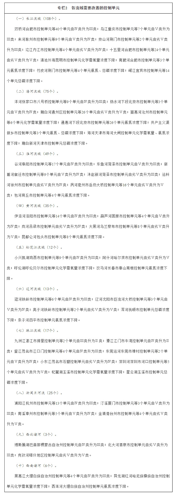 实施以控制单元为基础的水环境质量目标管理。依据主体功能区规划和行政区划,划定陆域控制单元,建立流域、水生态控制区、水环境控制单元三级分区体系。实施以控制单元为空间基础、以断面水质为管理目标、以排污许可制为核心的流域水环境质量目标管理。优化控制单元水质断面监测网络,建立控制单元产排污与断面水质响应反馈机制,明确划分控制单元水环境质量责任,从严控制污染物排放量。全面推行“河长制”。在黄河、淮河等流域进行试点,分期分批科学确定生态流量(水位),作为流域水量调度的重要参考。深入实施《水污染防治行动计划》,落实控制单元治污责任,完成目标任务。固定污染源排放为主的控制单元,要确定区域、流域重点水污染物和主要超标污染物排放控制目标,实施基于改善水质要求的排污许可,将治污任务逐一落实到控制单元内的各排污单位(含污水处理厂、设有排放口的规模化畜禽养殖单位)。面源(分散源)污染为主或严重缺水的控制单元,要采用政策激励、加强监管以及确保生态基流等措施改善水生态环境。自2017年起,各省份要定期向社会公开控制单元水环境质量目标管理情况。