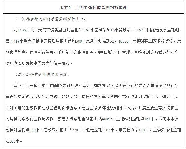 加强生态环境监测网络建设。统一规划、优化环境质量监测点位,建设涵盖大气、水、土壤、噪声、辐射等要素,布局合理、功能完善的全国环境质量监测网络,实现生态环境监测信息集成共享。大气、地表水环境质量监测点位总体覆盖80%左右的区县,人口密集的区县实现全覆盖,土壤环境质量监测点位实现全覆盖。提高大气环境质量预报和污染预警水平,强化污染源追踪与解析,地级及以上城市开展大气环境质量预报。建设国家水质监测预警平台。加强饮用水水源和土壤中持久性、生物富集性以及对人体健康危害大的污染物监测。加强重点流域城镇集中式饮用水水源水质、水体放射性监测和预警。建立天地一体化的生态遥感监测系统,实现环境卫星组网运行,加强无人机遥感监测和地面生态监测。构建生物多样性观测网络。