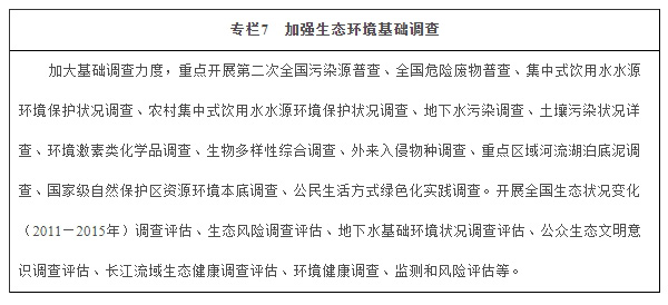 加强生态环保信息系统建设。组织开展第二次全国污染源普查,建立完善全国污染源基本单位名录。加强环境统计能力,将小微企业纳入环境统计范围,梳理污染物排放数据,逐步实现各套数据的整合和归真。建立典型生态区基础数据库和信息管理系统。建设和完善全国统一、覆盖全面的实时在线环境监测监控系统。加快生态环境大数据平台建设,实现生态环境质量、污染源排放、环境执法、环评管理、自然生态、核与辐射等数据整合集成、动态更新,建立信息公开和共享平台,启动生态环境大数据建设试点。提高智慧环境管理技术水平,重点提升环境污染治理工艺自动化、智能化技术水平,建立环保数据共享与产品服务业务体系。