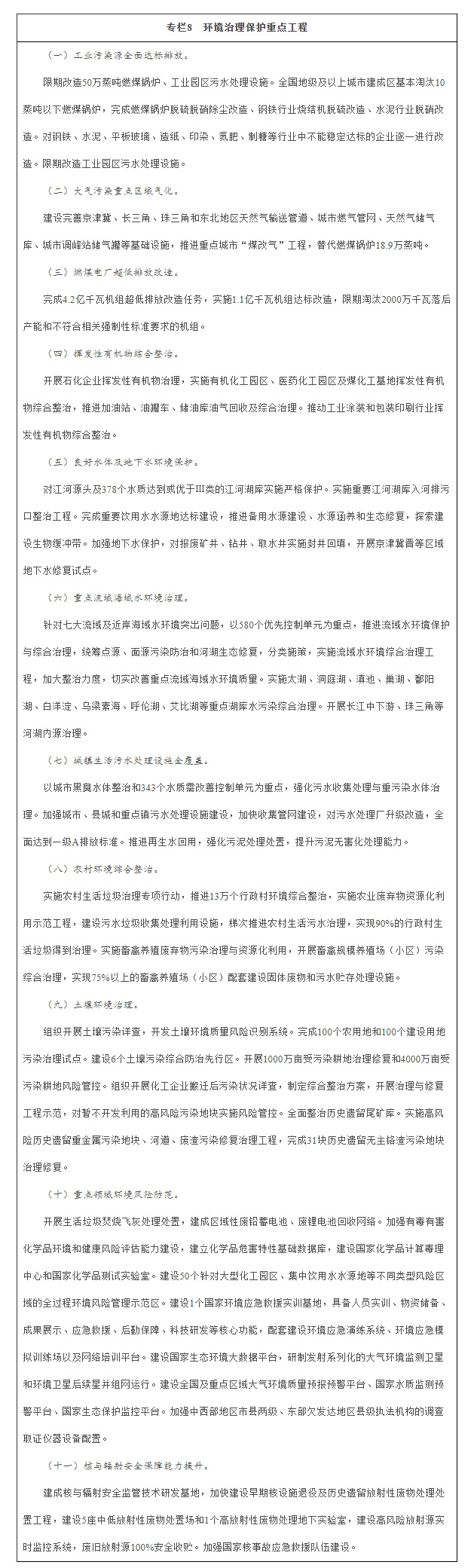 “十三五”期间,国家组织实施工业污染源全面达标排放等25项重点工程,建立重大项目库,强化项目绩效管理。项目投入以企业和地方政府为主,中央财政予以适当支持。