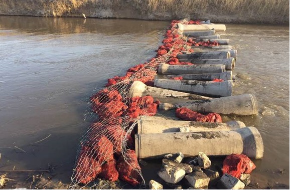 拦截降污。1月18日下午,根据环境保护部专家意见,稷山、河津、万荣等地汾河沿线全面开展构筑水泥管活性炭拦截坝工作。1月18日夜,环境保护部工作组到达运城市,连夜沿汾河入黄河口断面,从下游往上逐点查看了万荣、河津、稷山、新绛县汾河水质情况和水泥管活性炭吸附坝建筑情况,及时提出要根据污染团带迁移情况准确确定活性炭的投放地点和时间,最大限度保障吸附效率。19日凌晨,环境保护部工作组抵达事故现场,主持召开专题研讨会,要求河津和万荣两地加固加密吸附坝,及时更换活性炭,确保污染物在万荣县境内得到有效控制,入黄污染物浓度控制在0.15mg/L以下。因为苯比水轻,水泥管应按顺水流方向摆放并有一定间隔,水泥管上下几层要交错摆放,这样可以放置活性炭,而且活性炭的摆放高度要略高于水面。事发地下游新绛、稷山、河津、万荣四县市共筑构了36道活性炭、草帘、秸秆等吸附坝,包括4道水泥管为主体的吸附坝,并24小时值守,防止发生溃坝事件,同时定期添加吸附原材料,持续保障吸附效率。