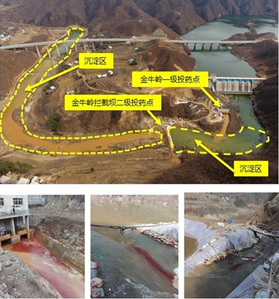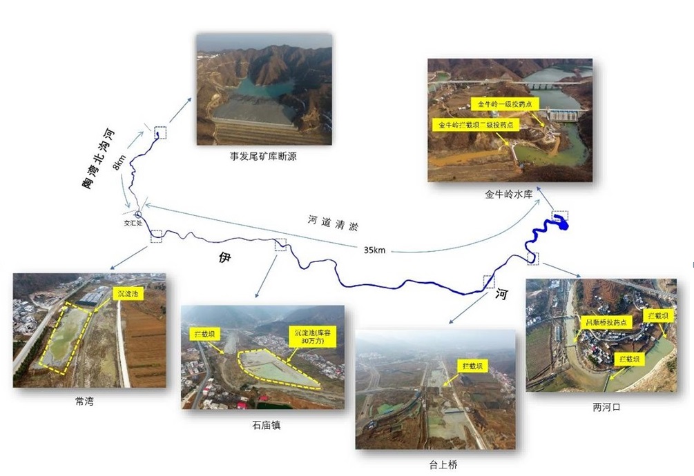 筑坝拦截。2月15日开始,栾川县人民政府组织在伊河受影响的35公里干流河道分段设置拦截坝、开挖临时沉淀池,在拦截污染水体、调节下泄流量、为投药降污创造有利条件等方面发挥重要作用。